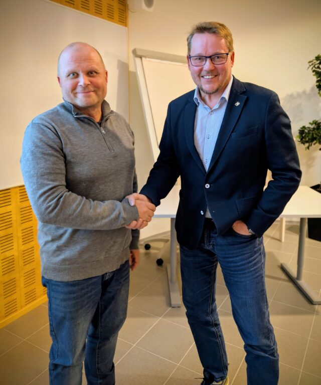 Puheenjohtajat yhteiskuvassa: tehtävässä aloittava Juha Vimpari ja väistyvä Perttu Hietanen.